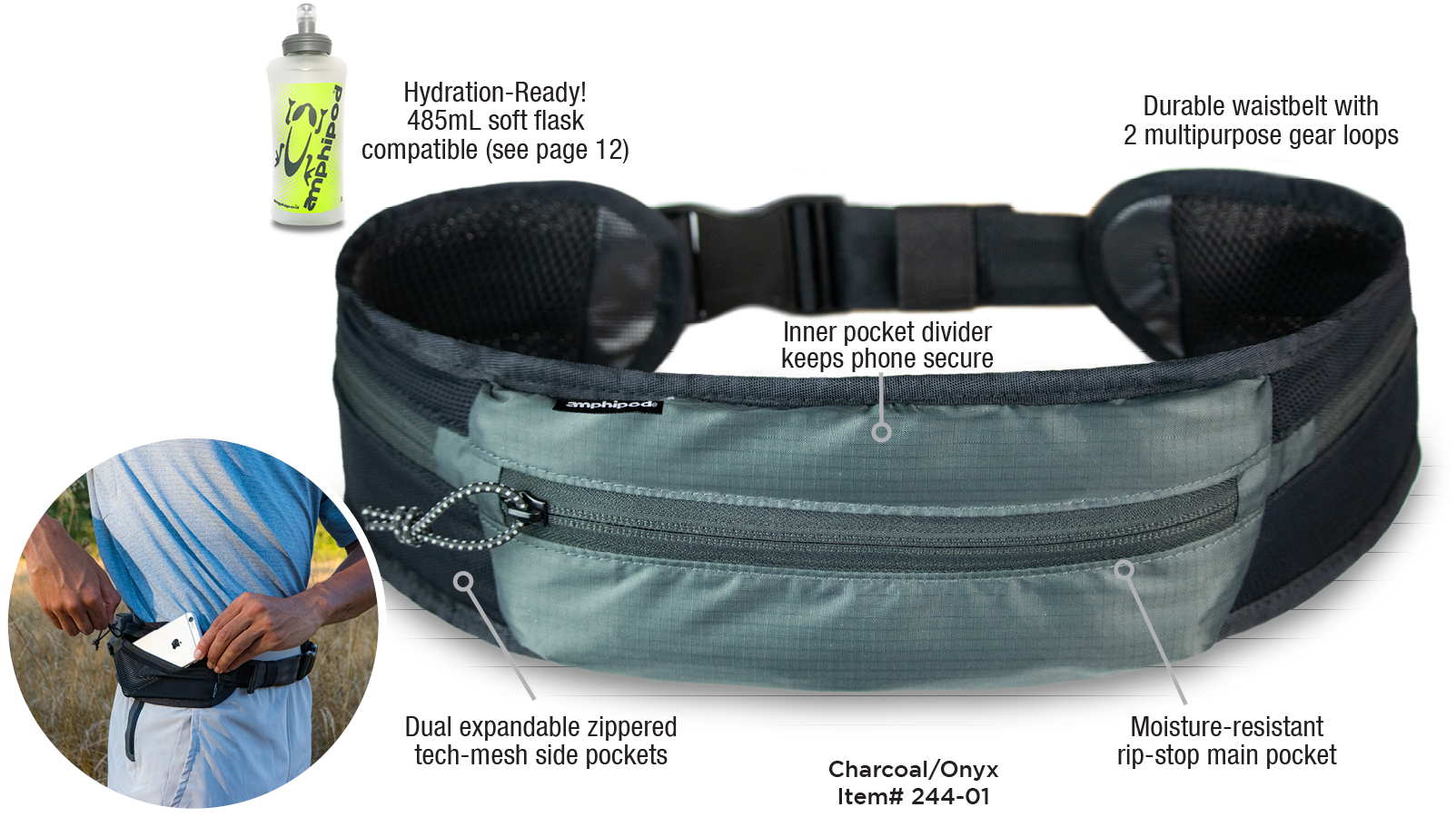 This belt maximizes storage in a comfortable, ultralight and breathable hybrid design with a central rip-stop moisture protective compartment and dual expandable hip hugging side mesh pockets.