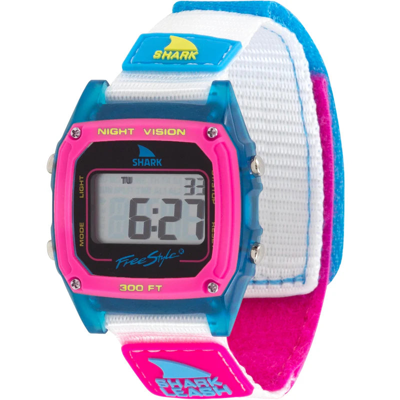 The FreestyleUSA Shark Classic is a durable, water-resistant digital watch with a retro style, updated for modern comfort and performance. Key features include a 100-meter water resistance, a flexible silicone or polyester band, and a secure clip or leash closure. The watch includes modern functions like a stopwatch, countdown timer, dual time, and an alarm, along with a Night Vision backlight and "Hydro-Pushers" for underwater use.